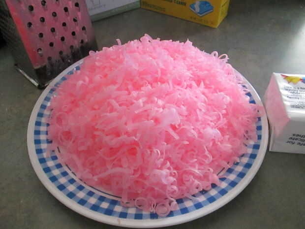 Mientras se calienta el agua, usar el rallador para rallar el jabón Zote (puede utilizar Fels Naptha o Kirks Castilla) en un montón de escamas.  Hermosa!