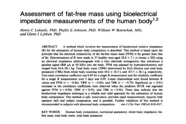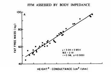 La anterior relación fue encontrada por Lukaski, et al., en su papel de evaluación de la masa libre de grasa utilizando mediciones de impedancia bioeléctrica del cuerpo humano.
