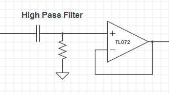 El filtro atenúa las frecuencias que están por debajo de la frecuencia de corte. Decidimos utilizar una señal de 10 kHz, por lo tanto, se cortarán las frecuencias por debajo de 10 kHz. Esto se logró utilizando un condensador de 10 nF y un resistor de 10 kΩ.