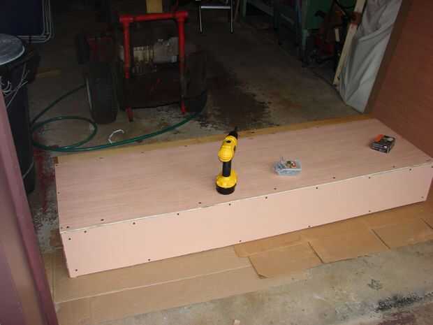 Cuando están secando las piernas, luego agregué la parte de atrás, frente y fondo acabado de piezas. Primero quité que ese temporal corta hoja de madera contrachapada y luego poner la espalda, pegando los bordes y el atornillar todos juntos. el pegamento aquí realmente hace de esta unidad fuerte y rígido, sin bamboleo y el tornillo mantienen unida como se seca. Como siempre, Pretaladre orificios piloto de 1/8" en su madera tornillo para mantener la madera de la división.