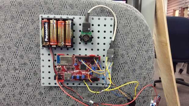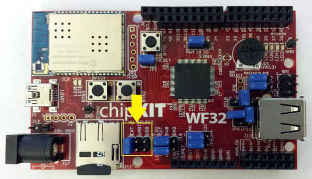 En primer lugar, ya que vamos a poder el chipKIT WF32 con baterías, tenemos que mover el puente en la foto arriba a la posición EXT.