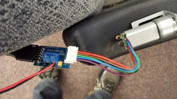 Ahora conectamos PmodHB5. Pin 1 determina la dirección del motor así que conecte ese canal de digital 26 el WF32. Pin 2 es el pin PWM tan conéctelo a la clavija 3 en la WF32 (pin PWM). Patillas 3 y 4 en el PmodHB5 son sensores que podemos pasar por alto. Conectar el pin 5 a masa y el pin 6 a 3, 3V. Ahora conectar el PmodHB5 al motor mediante el conector como lo es en la foto superior.
