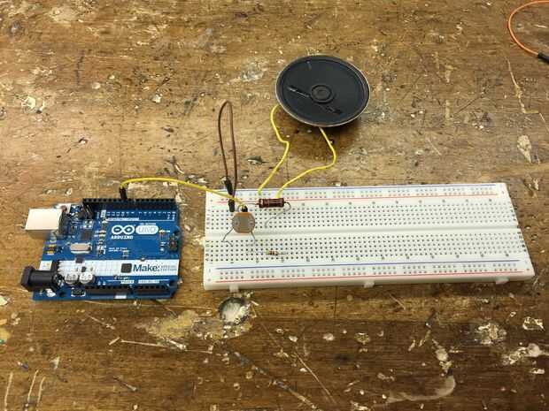 Haz un Arduino, protoboard, fotocélula y altavoz de 8 ohmios.