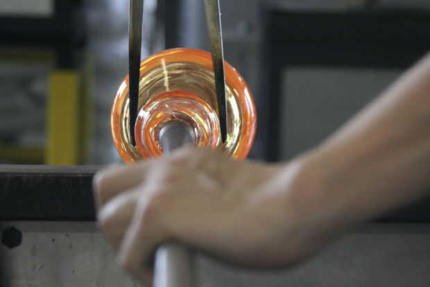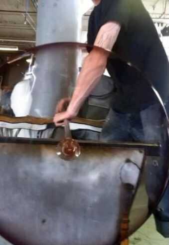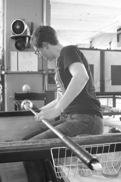 Para crear una superficie plana para nuestra plantilla de vidrio, hemos creado un rondel! Un rondel de cristal soplado términos en una esfera de soplado es hecho girar hacia fuera (como se ve en la última foto) para crear un plano y superficie redondeada. Esto es tradicionalmente como cristal de la ventana fue hecha antes de procesos donde se cortaron y aplanados largos cilindros de fabricación a gran escala. Rondels también son utilizados por algunos artistas de cristal mancha y fundición.