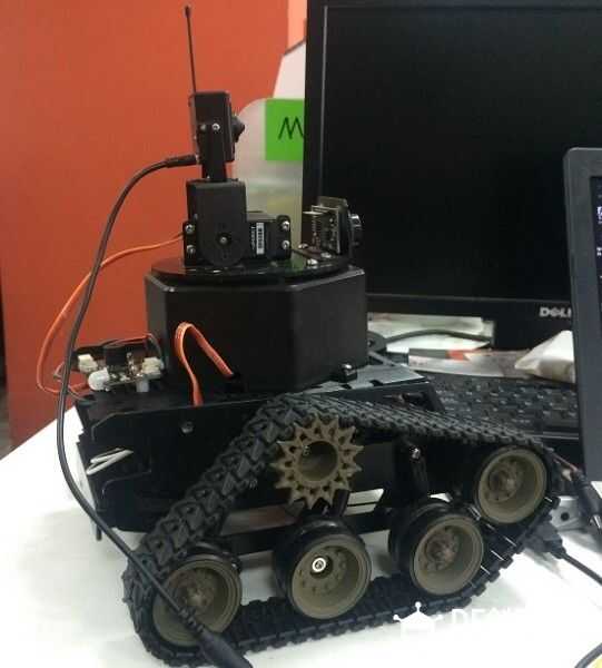 Contamos con un montaje de cámara 2DOF tilt'n vuelta instalado en la parte superior del robot a controlar la orientación de la cámara. La cámara web que utilicé en el robot se conecta al ordenador vía Bluetooth.