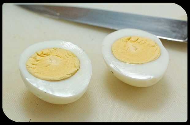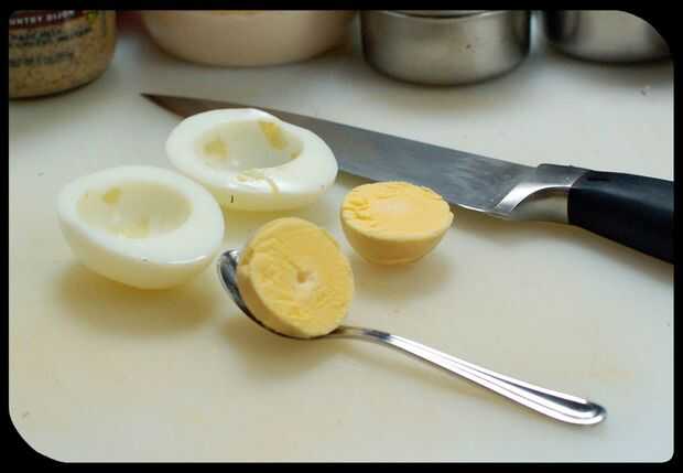 Después de cortar los huevos por la mitad longitudinalmente, tome una cuchara y quitar las yemas de los huevos.