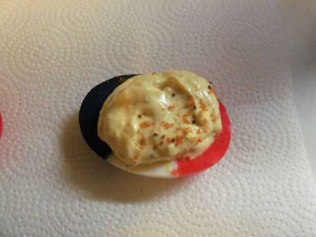 Una vez pelados y reducido a la mitad simplemente utilizar un pincel pequeño para pintar colorante a cada lado del huevo.
