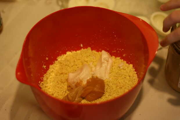 - 3 cucharadas de mayonesa. Si usted no tiene ninguna mayonesa, aumentando las proporciones del resto de los ingredientes será sustituir adecuadamente pero mayo es una buena base y hace el relleno cremoso.