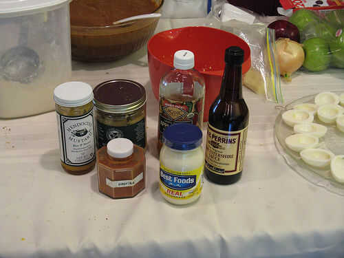 - 3 cucharadas de mostaza. Usé 2 clases, una versión dulce caliente y un clásico Dijon. Usted puede dejar a la mostaza (a menos que se haya excluido la mayo) pero los huevos serán menos devilly.