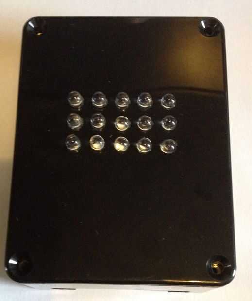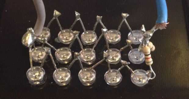 Los LED se empujó en los agujeros y luego soldados junto con las resistencias, como en el diagrama de cableado.