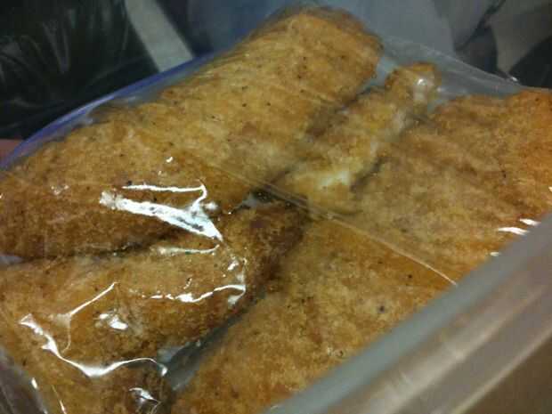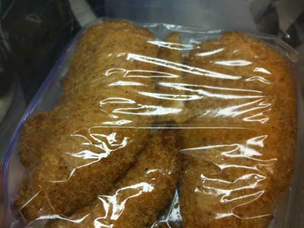 Lo primero es lo primero, empecé con mi fundación y yo al horno las pechugas de pollo crujientes de Costco para poner en la parte inferior, aparecen como arena, y sin embargo, darle algo para masticar. Asegúrese de sellar bien en las bolsas ziploc, sacar el aire y doblar las bolsas alrededor del pollo.