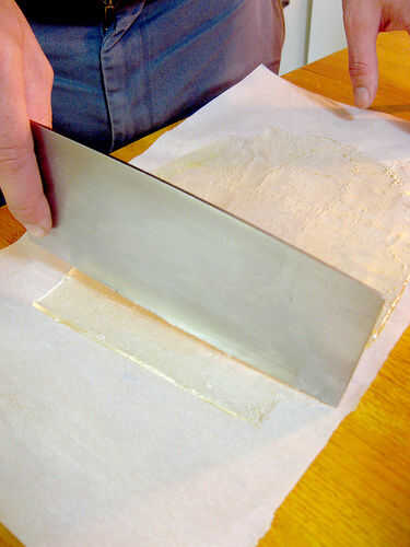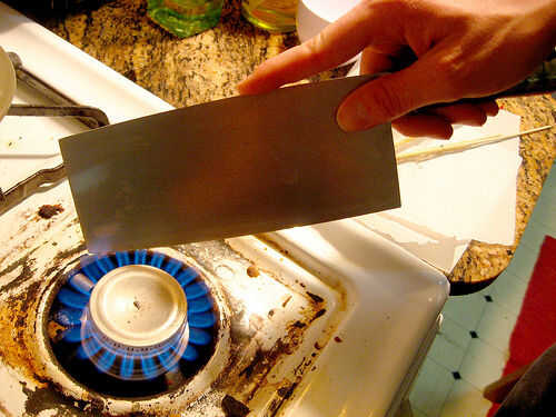 Este paso puede ser un poco molesto. No te preocupes si se rompe un poco, pasa. REHEAT (recalentar) la hoja para cada corte. Entre cada corte, lavar la hoja con agua para mantener el azúcar de la quema de la hoja. No sugiero utilizar la navaja mejor, puesto que este calentamiento y enfriamiento no son el mejor tratamiento para la lámina de su chef. Si los bordes son muy ásperos, sumergir su dedo y el agua y alisar hacia fuera.