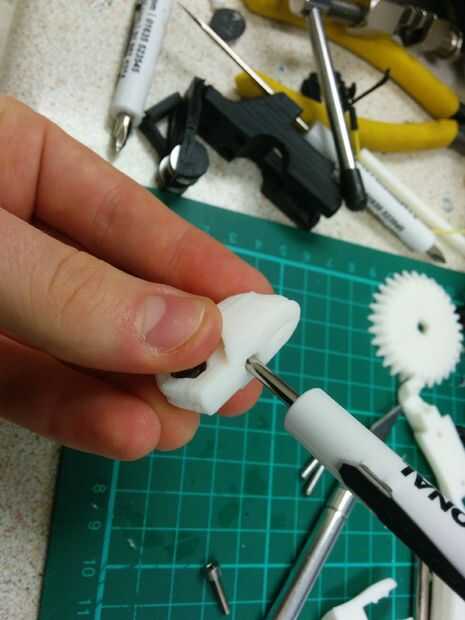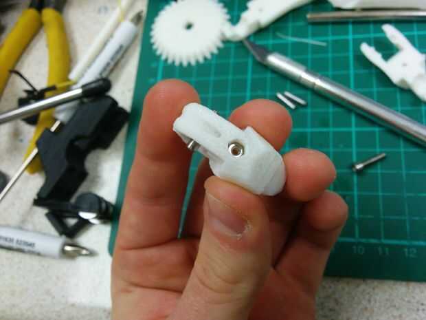 3. tomar la parte de atrás de la mitad de la articulación del media y colocar la otra 12mm clavija del cojinete en la ranura. También colocar la punta de los dedos montado en las ranuras más pequeñas en el otro extremo.