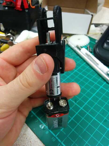 1. usando la batería de 9V, gire el motor del eje de modo que el lado plano esté orientada hacia arriba (lejos de los rodamientos de tensor).