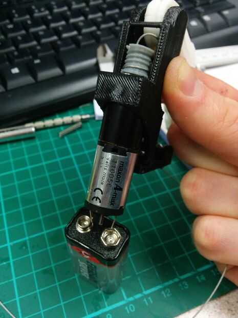 2. el tendón más cercano el motor primero, coge este tendón y sostenlo mientras utiliza la batería de 9V para girar el motor para que el tendón se envuelve alrededor de la bobina del hilo de rosca.