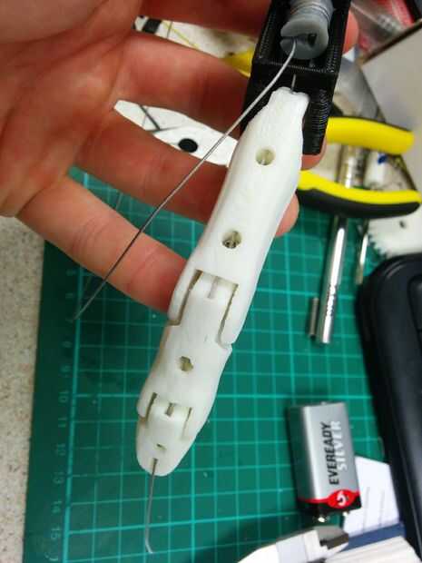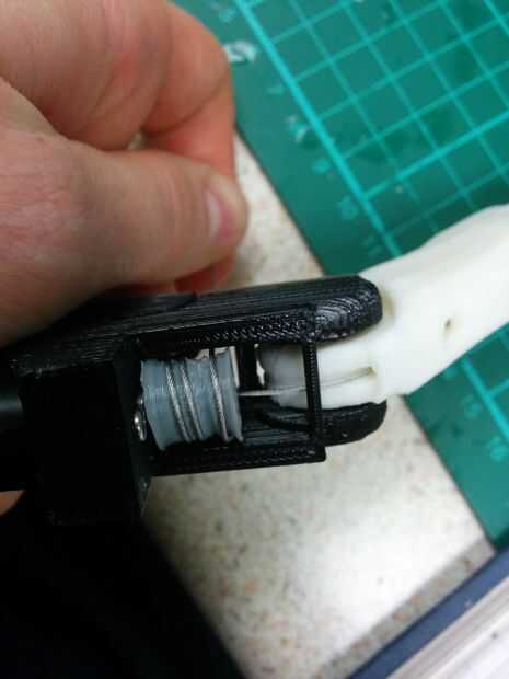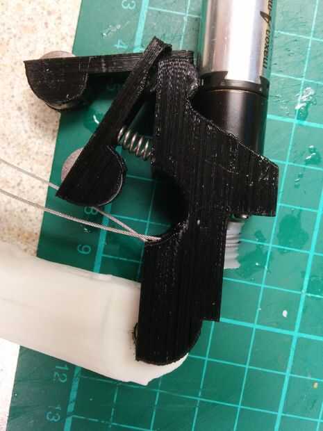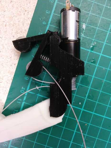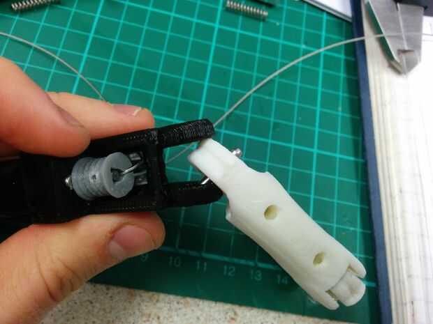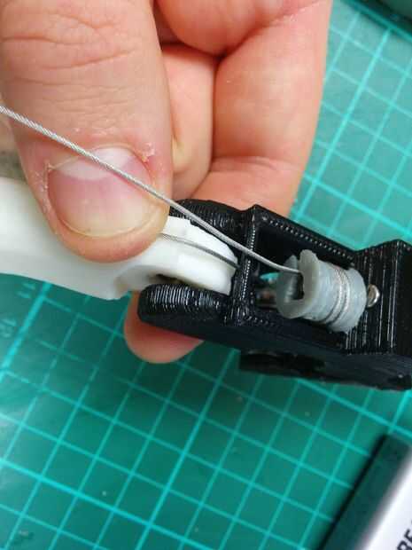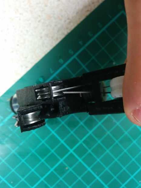 6. Enrosque el tendón a través de la Asamblea, debe ir en el interior de la broca ya roscado del tendón y en la tira de plástico en la carcasa del motor (mirar las fotos para una mejor idea).