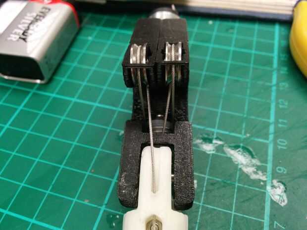 8. ahora para el otro tendón. Mientras que esto es ser roscado, tratar de mantener el primero de ellos enseñado por lo que se queda en el carrete. Tomar este tendón y envuélvalo sobre el carrete, roscar hacia abajo a través de la Asamblea. Sólo necesita una bobina como se muestra en la imagen.