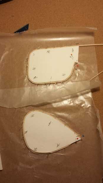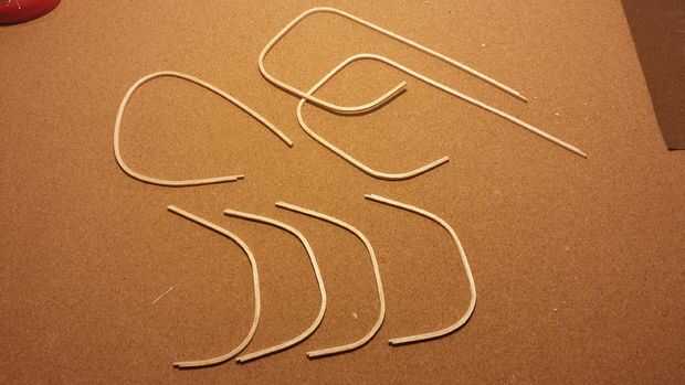 Para doblar la balsa madera puse las 2 piezas en agua tibia durante 5 minutos hasta que fue realmente suave, luego pegar las 2 piezas (pegamento blanco) al mismo tiempo estaba doblando la madera alrededor de las plantillas, puse alfileres alrededor de los contornos para mantenerlo en su lugar, también pongo papel encerado debajo para que la madera no se pegue a la banca.