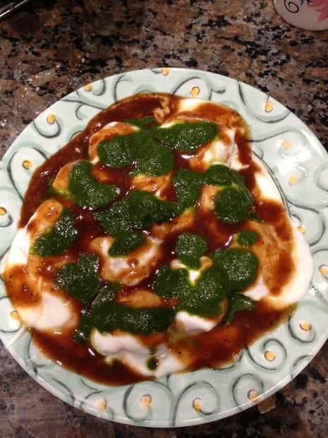 Poner yogur revuelto encima de las bolas de masa, agregue salsa picante verde y chutney de Tamarindo en la parte superior. Comer una bola de masa en un bocado para degustar todos los sabores!