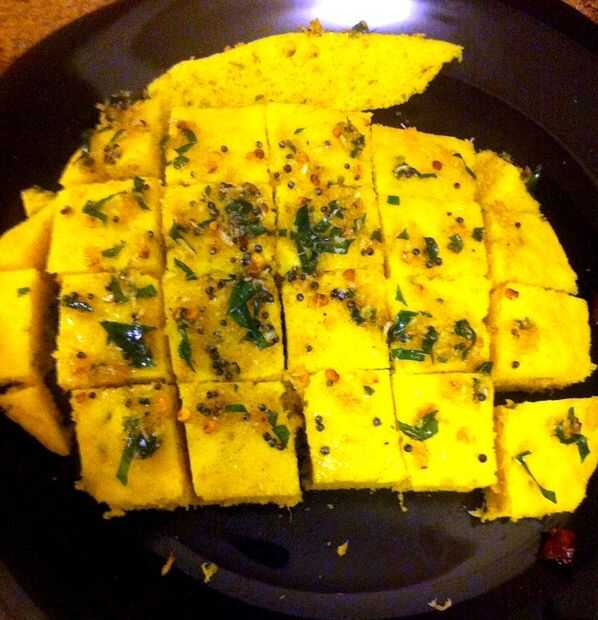 13. Podría hacer condimento y vierta encima el dhokla, luego cortar en mordida pequeños y servir caliente.