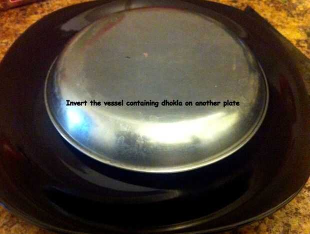 16. Para cocinar en microondas, post paso 6, en lugar de verter la mezcla en un recipiente normal, vierta la mezcla en un tazón engrasado microondas, cubra con otra placa seguro de microondas y cocinar en microondas durante 3 minutos. Luego revísela y cocinar otros 2 minutos. Mi cocina en 5 minutos. Inserte un tenedor y si sale limpio el dhokla es hecho. Dejarlo reposar 10 minutos antes de sazón y corte como se menciona en el paso 12 a 14.