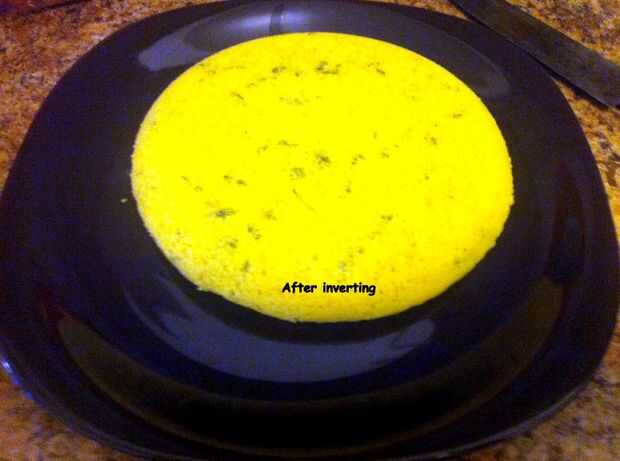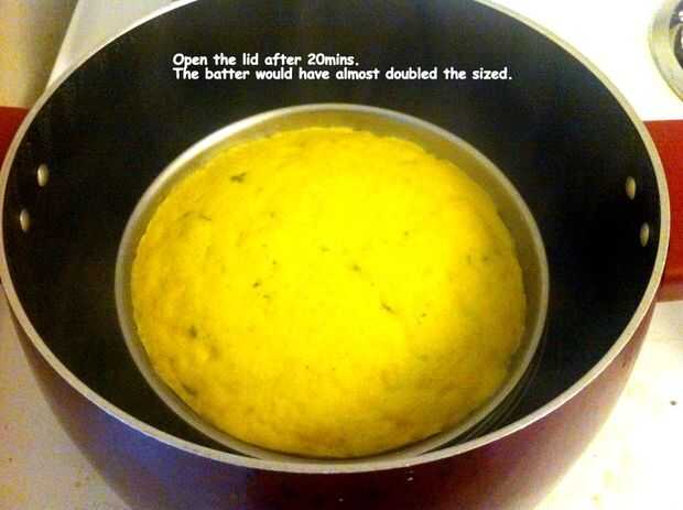 9. Después de 20 minutos, abrir la tapa, la masa cocida/dhokla casi se habría duplicado en tamaño y será esponjoso.