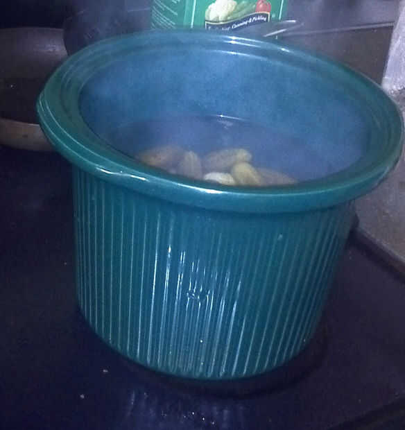 Vierta la solución de salmuera hirviendo sobre los pepinos. Cubrir con la placa y el peso hacia abajo. Es importante que la salmuera cubre completamente los pepinos.