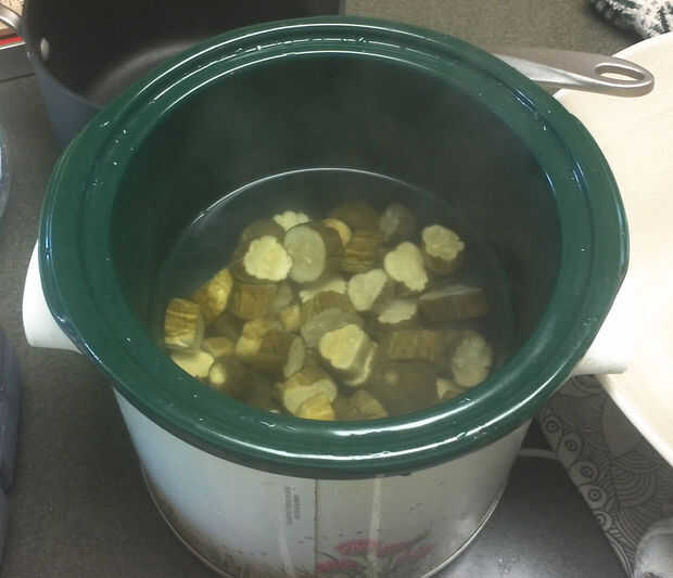 Añadir 1/3 cucharadas en polvo alumbre a 1/3 galones de agua dulce y poner a hervir mientras estás preparando tus pepinos.