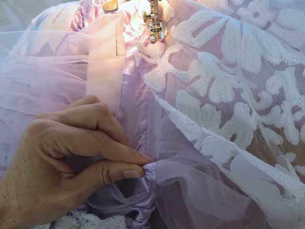 Luego cosió el cordón hacia abajo, asegurándose de que estirar el elástico en la pretina del tutu como cosí. De esta manera el encaje termina se reunieron alrededor de la cintura del tutu y se conserva el tramo de la pretina.