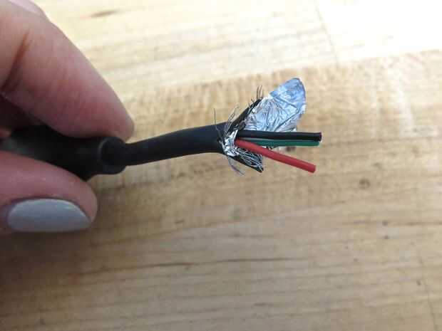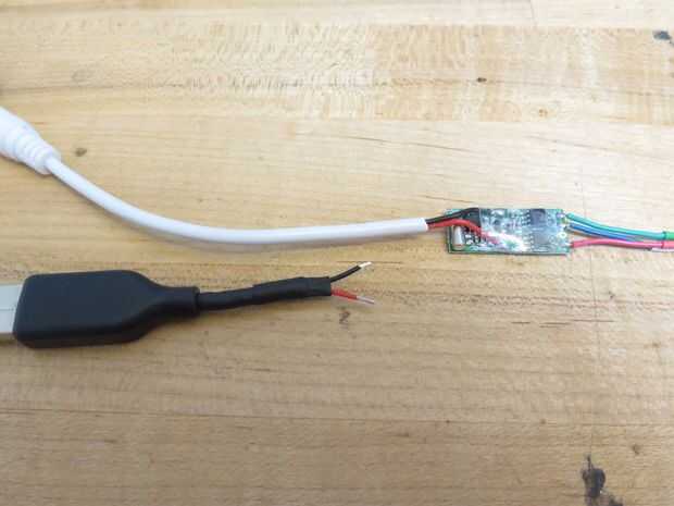 Medí la distancia desde donde la banda iba a sentarse en la falda a la batería y luego soldar el conector USB en el otro extremo del chip controlador en una longitud adecuada. Cuando usted corta el cable de USB, verá mucho pasando porque el USB también puede llevar los datos. Para mis propósitos aquí, me preocupaba sólo con energía que transmite, así que sólo necesitaba los cables rojo y negro. Recortan los otros detrás y calor reducidos sobre ellos. Había soldado la tierra y el poder de la USB a los cables desde el chip. Después del encogimiento del calor reducido sobre todo (chip, soldadura común etc.) con calor blanco para protegerlo.