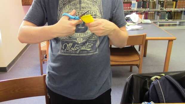 Paso 18: Para la hebilla, tomar la pieza de fieltro amarillo y cortar un cuadrado de fieltro amarillo