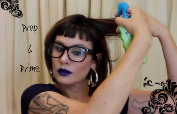 Como preparar y preparar nuestra piel antes de ponerse maquillaje, nos vas a preparar y cebar el cabello para protegerlo y ayudar a mantener el estilo. Asegúrese de que su cabello es clean(ish) y seco, y luego rociar generosamente con un protector de calor. Estoy usando a Got2B caliente Twist Curl plancha Styler.