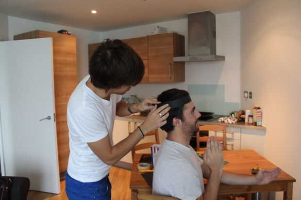 Cortar una franja de 2" y ajustar un anillo para el tamaño de su cabeza.