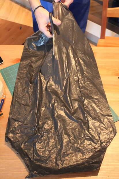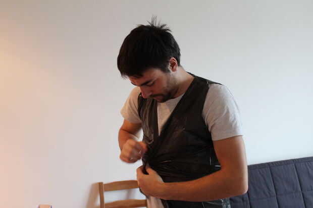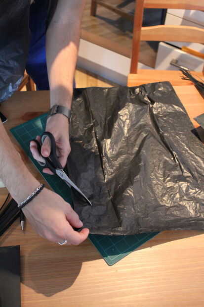 Para el traje negro, sólo cortar las esquinas de una bolsa de basura (50-100L) y cortar por el medio. Deslice los brazos en los agujeros y tienes tu traje de fantasía.