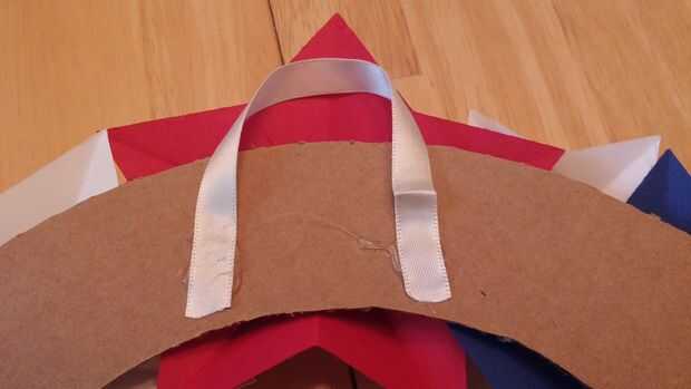 Casi listo! El último paso es usar una pequeña longitud de cinta como nuestra suspensión de guirnalda. Asegúrese que cuando dobla por la mitad, la cinta es suficiente para hacer un ciclo de suspensión. Encontrar que parte de su corona le gustaría estar siempre en la parte superior. Use esto como guía sobre dónde colocar la suspensión. Pegamento caliente los extremos de la cinta a la parte posterior del anillo de cartón soporte. Esto proporcionará un camino firme para colgar su corona en un gancho de puerta o en un clavo/amurado en la pared. La corona es muy ligera, por lo que la cinta tendrá un montón de tener fuerza.