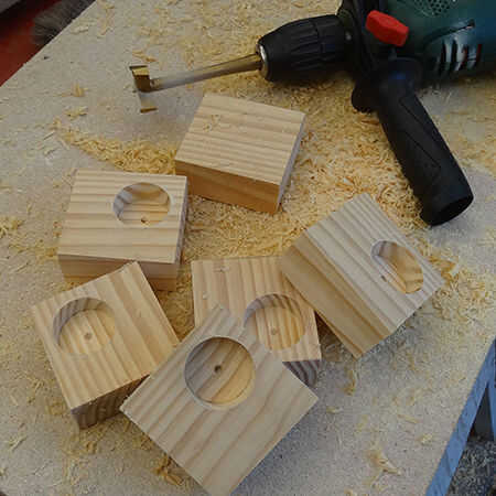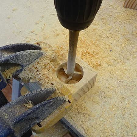 Para hacer los agujeros en los bloques es mejor utilizar un poco loco. Compré un conjunto completo de MAD bits y utiliza una broca de 35mm para perforar los orificios. Un poco loco tiene una punta más pequeña que una punta de pala y encontrarlos más fácil y más seguro utilizar eso brocas de pala.
