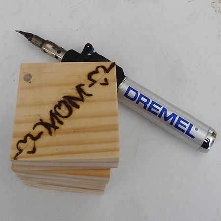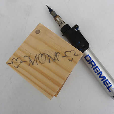 Dibujar su texto en el cuadro superior y luego usar un soldador Dremel VersaTip para quemar la madera.