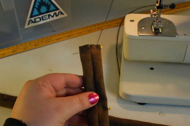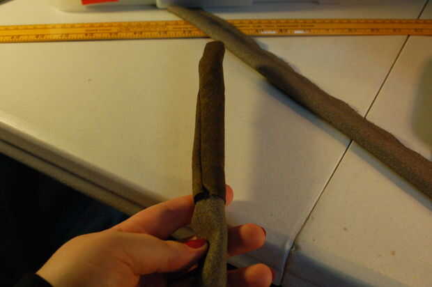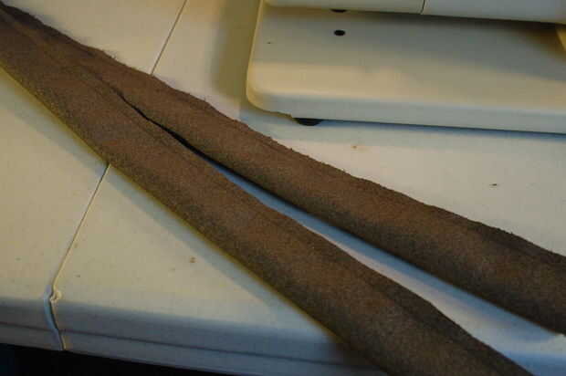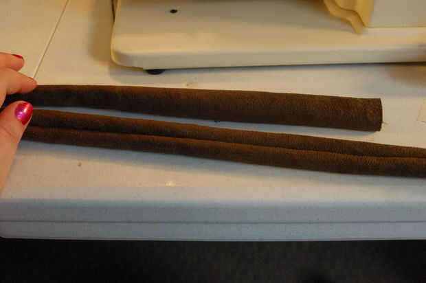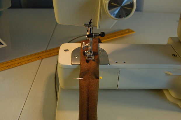 Ahora vamos a cerrar las manijas. Desea por doblar cada una de las piezas de tela en mitad a lo largo, lado incorrecto hacia fuera. Luego realizar una puntada larga en el borde para cerrar las asas (dejar las dos partes plegadas). Las manijas deben ahora algo se asemejan a una paja. Ahora gire las manijas de sus lado derecho hacia fuera. Esto puede tomar un tiempo. Utilizo una percha de metal para ayudar a mantener a la tela recta.