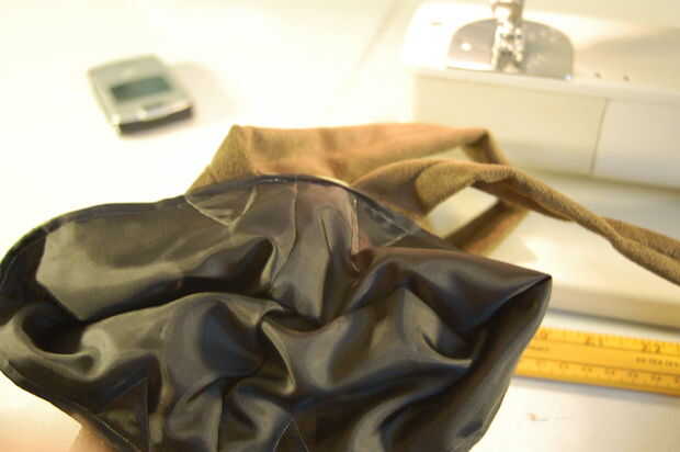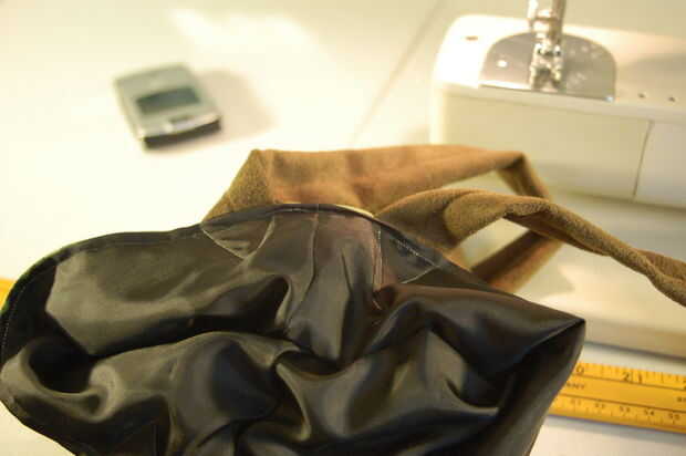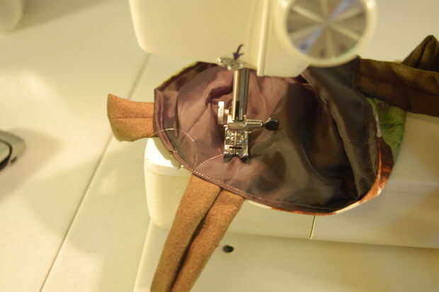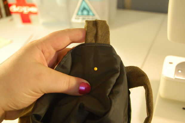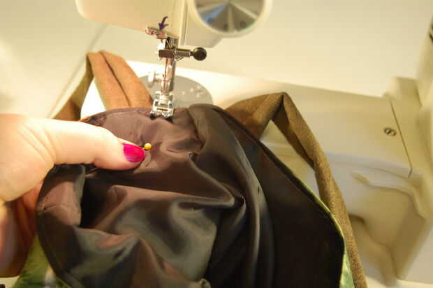 Ahora que hemos conseguido las manijas puestas realmente encendido, nuestro último paso es fijar en su lugar. Simplemente vas a hacer una puntada en forma de "V" en cada uno de los lugares donde se insertó un mango. Sólo coser diagonalmente hacia el centro del borde de la empuñadura de la orilla de la bolsa (me gusta colocar un alfiler en el centro de seguimiento). Girar y coser diagonalmente opuesta para terminar la "V". Sus tiradores han sido bloqueados en su lugar y haya terminado con su bolso de mano!