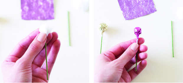 Para hacer el centro de la flor, corte una bola de algodón en cuartos. Contra el extremo de un alambre floral, recoger el papel de color alrededor de él y de la torcedura en la base.