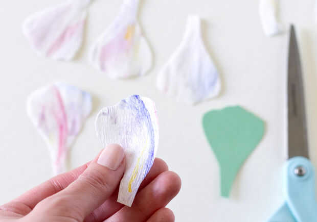 Crear una plantilla de pétalo de la flor con un pedazo de papel. Mis pétalos son cerca de 2 pulgadas de largo por 1,5 pulgadas de ancho con un borde festonado. Corta cinco pétalos de la crepe pintada con el grano corre verticalmente. Suavemente estire el centro y los bordes y reunir la base de cada pétalo.