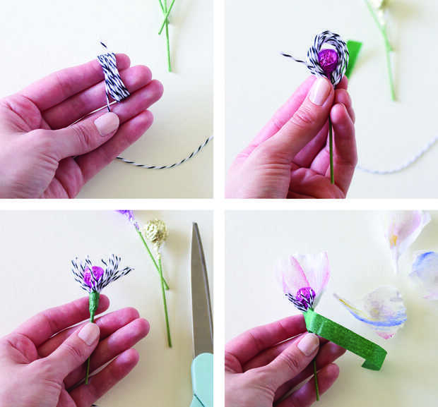 Para crear el estambre de la flor, envuelva la guita del panadero alrededor de dos o tres dedos 12 veces. Sostiene en un paquete, inserte el extremo del tallo por el medio de los lazos. Sostenga la cuerda en la base del centro de la hoja y envuelva con cinta floral. Cortar el lazo del centro de la cuerda, luego recortar todas las piezas a la misma longitud. Coloque cada pétalo en el tallo con la cinta, un poco superpuestas cada uno.