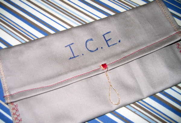 Si incluso tiene limitados conocimientos de costura, solo coser una bolsa pequeña de una lona de PVC forrado, escriba hielo en marcador permanente e inserta una copia de papel doblado de la información médica.