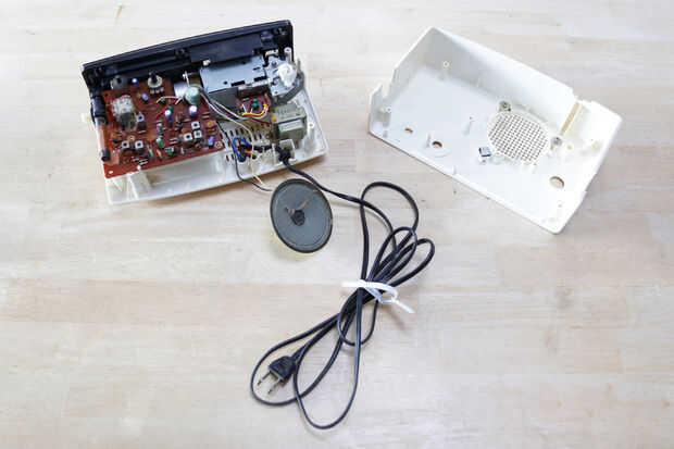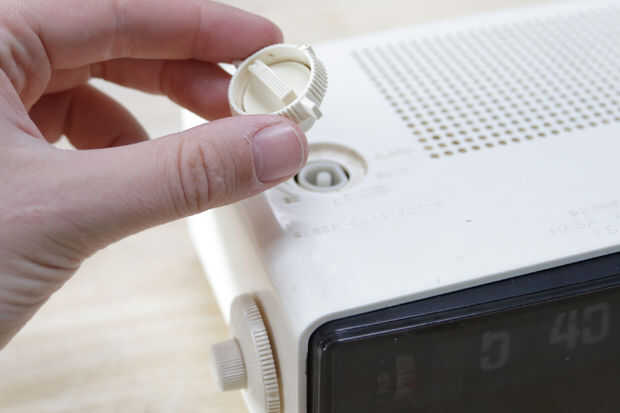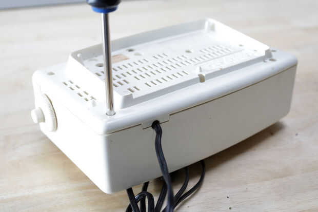 Tire de las perillas y luego retire los tornillos de la parte inferior de la alarma para liberar la cubierta superior de plástico.