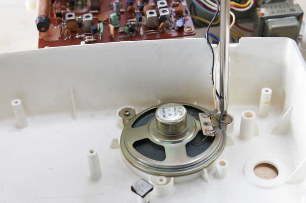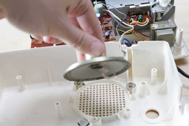 Retire los tornillos que sujetan el altavoz en lugar de separar la parte superior de la parte inferior.