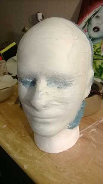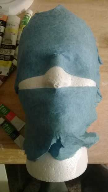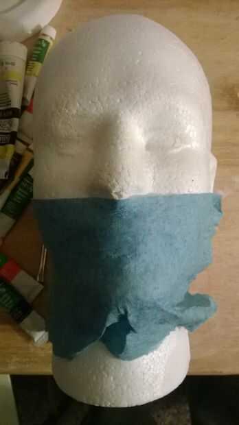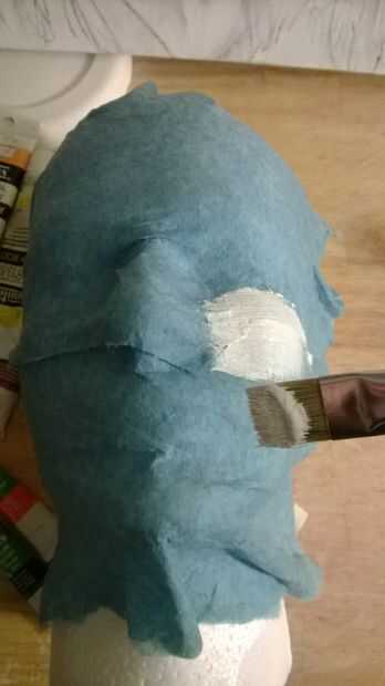 Rasgar las toallas de la tienda por la mitad y sumerja en agua. Asegúrese de que sonar hacia fuera. Pintar la superficie de la forma principal con la pasta de yeso y luego estirar las toallas húmedas sobre su cabeza de espuma y alisar la toalla lo mejor pueda a partir de las características en la parte delantera de la máscara y trabajando hacia la parte posterior de la cabeza. Trate de capa para las costuras de la toalla de papel no están pegado encima de demasiado. Ahora la pintura sobre la pasta de yeso con un cepillo medio con cuidado alrededor de las aberturas para que no conseguir cubiertas en pasta. Después de dejarlo secar, agregar una segunda capa para que sea más resistente.