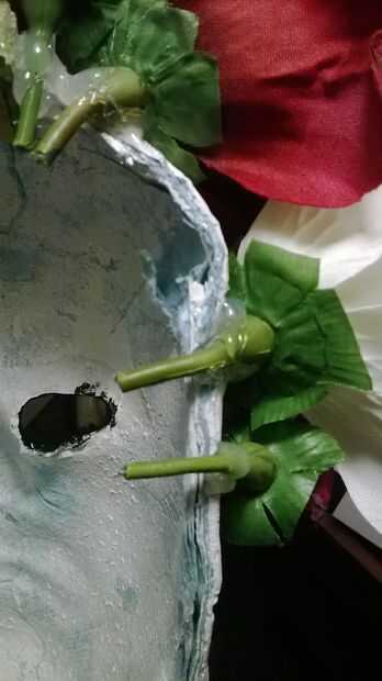 Para colocar las flores falsas en la parte superior y los lados de la máscara, utilizar tijeras de alambre para eliminarlos de sus tallos y pegamento caliente en el lugar.
