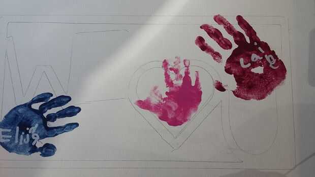 Esto era la parte más difícil, ya que su supuesta a ser una sorpresa para mi esposa y yo no puedo llevar a los niños a trabajar... pone la pintura acrílica en los niños de la mano y presionarlo sobre el lienzo, la impresión en el corazón es mis hijas 1yo y era muy diferente para conseguir una buena impresión porque le resultaba divertido para tratar de agarrar la lona mientras estaba tratando de presionar su mano en él , dejó las huellas en seco, deje que los niños escriben sus nombres en sus impresiones con un marcador de pintura blanca y para imprimir los babys planeo escribir "día de las madres 2016"
