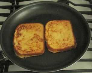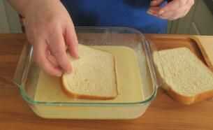 mojar cada rebanada de pan en la mezcla de huevo justo antes de añadir el pan a la sartén, o si no quiere ensuciarse las manos, usted puede cucharón en. (Fig. 6)