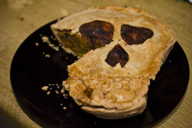 Esta es una receta de pastel salado perfecta para la cena, y unos simples ajustes en el plato de tarta con la ayuda de papel de aluminio es todo lo que necesita para producir esta forma eficaz de cráneo!